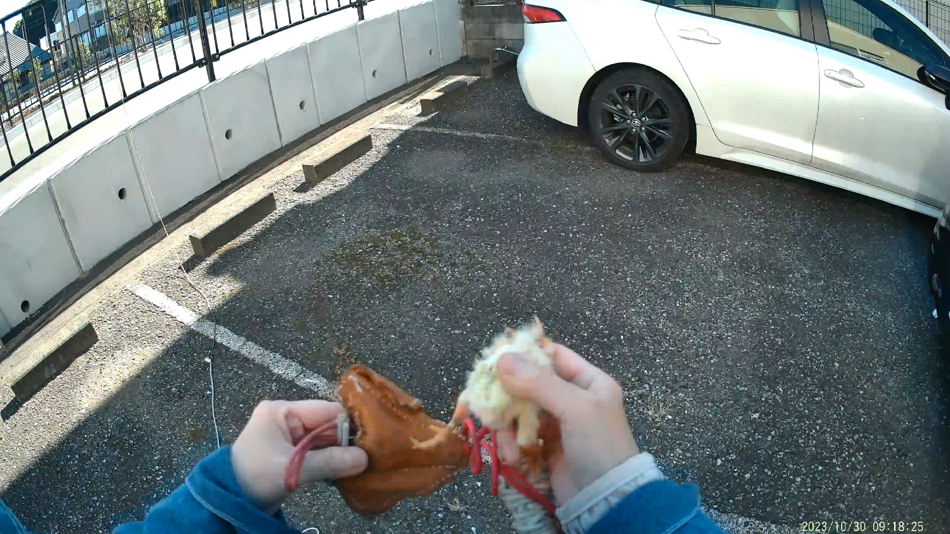鷹がグローブに足を掛けたら、餌を握っていない方の手でルアーを覆い隠し、鷹にばれないように素早く引いてポケットなどに回収します。