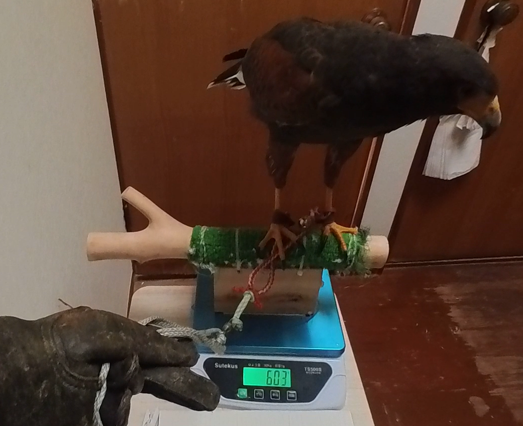 鷹の使役に慣れるまでは毎日体重を計測し、フライトコンディションを見る際の参考にします。