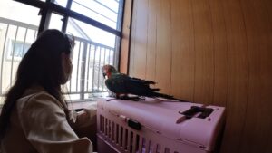 本来トレーニングはケージの見えない部屋で行うのですが、移動手段をまだ持てない私は、ケージから手に、手から止まり木に移す事すらできません。